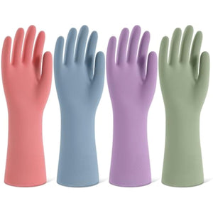 Your Reliable Cleaning Companion: Our cleaning gloves are made of premium, skin-friendly natural rubber. Whether you're washing dishes or tackling other cleaning tasks, they shield your hands from harsh chemicals like bleach and other harmful liquids. These gloves make tough cleaning tasks safer, easier, and more manageable, delivering unmatched reliability for your daily home chores. Grip That Never Slips: Featuring a embossed surface on the palms and fingers, the dish washing gloves deliver a secure anti-slip grip for dishwashing, cleaning, and handling wet or slippery items. Designed to enhance control and efficiency, they transform every cleaning task into a smooth and effortless experience. Comfort That Lasts: With a snug fit and a thin layer of flocked lining that makes them easy to slip on and off, our kitchen gloves ensure maximum comfort and flexibility for extended use. The moisture-absorbing lining keeps your hands dry, preventing discomfort during long cleaning sessions. These cleaning gloves are tailored for women and men who demand both practicality and comfort. Versatile and Durable: The dishwashing gloves excel in every cleaning scenario, from scrubbing greasy pots and pans to wiping down bathroom tiles with ease. Resistant to wear, tear, and cleaning agents, they are your trusted choice for reliable performance across all your cleaning needs – in kitchens, bathrooms, and beyond. Style Meets Function: This set includes 4 pairs of cleaning gloves in four unique colors, making it easy to assign each pair to specific tasks. Combining durability with functionality, these reusable rubber gloves not only simplify your cleaning routine but also add a pop of style to brighten your day with every use.