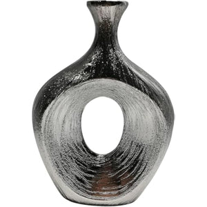 Sophisticated Glam Design: This 13-inch oval stoneware vase showcases a unique cut-out silhouette with a textured scratched finish in metallic silver. Its bold, modern design adds refined elegance and sculptural artistry to any interior décor style. Durable Stoneware Build: Crafted from premium stoneware, this vase ensures stability, longevity, and a polished appearance. The sturdy construction highlights its textured finish, making it a reliable decorative piece for everyday home styling. Distinctive Decorative Size: Measuring 13 inches tall with a 9 x 3 profile, this vase makes a strong impact whether used for fresh flowers, dried stems, or displayed empty. Its striking cut-out design adds depth and character to tables or mantels. Versatile Home Accent: Ideal for living rooms, dining rooms, bedrooms, offices, or entryways, this vase blends effortlessly with glam, contemporary, and minimalist styles, providing an eye-catching focal point in any room of your home décor. Elegant Gift Choice: With its metallic silver finish, abstract cut-out shape, and textured detail, this vase makes a memorable housewarming, wedding, or holiday gift, appealing to décor enthusiasts who value artistry and modern sophistication.
